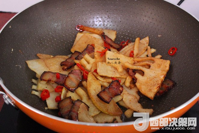 5.蒜末煸香,倒入筍爆炒至八成熟;