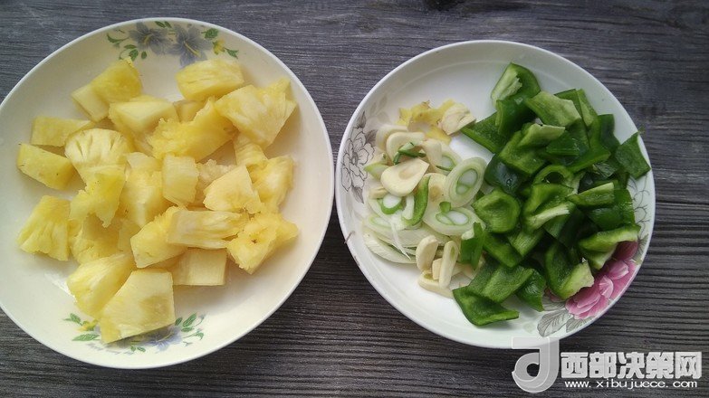 3.菠蘿肉切塊,青椒切塊,蔥姜蒜備用