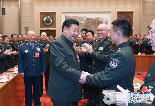 3月12日上午,中共中央總書記、國家主席、中央軍委主席習近平出席十三屆全國人大一次會議解放軍和武警部隊代表團全體會議。這是會議開始前,習近平親切接見與會代表。新華社記者 李剛 攝
