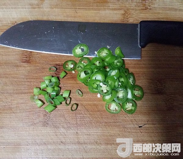 11.同時另起鍋燒熱油、下蔥花與杭椒爆香、然后趁熱淋在魚頭上