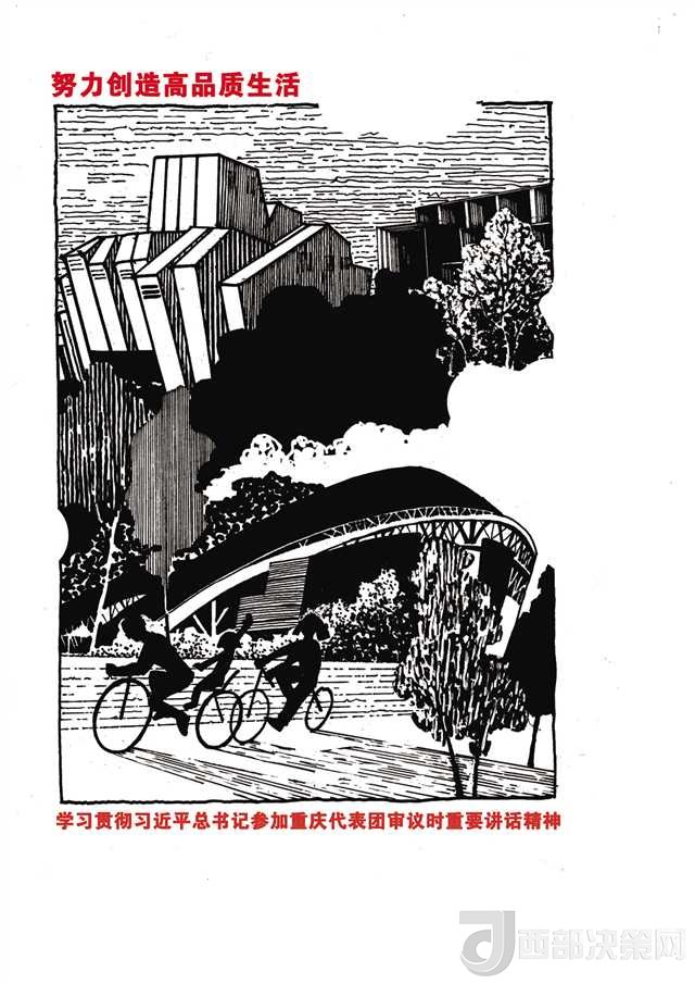另一組負責“創(chuàng)造高品質(zhì)生活”的師生也遭遇類似的問題。最初師生們想用一組市民在公園鍛煉的場景來闡述這個主題,但很快就發(fā)現(xiàn)這樣的畫面太簡單蒼白。最終,他們將重慶大劇院、重慶美術館、奧體中心等重慶的標志性建筑作為文化符號列入畫稿中,才有了令人耳目一新的感覺。