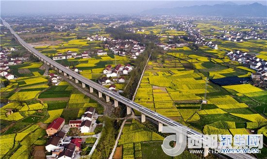 3月21日,一列動車正通過陜西省漢中市南鄭縣新集鎮(zhèn)油菜花海(無人機(jī)拍攝)。新華社記者 陶明 攝