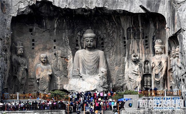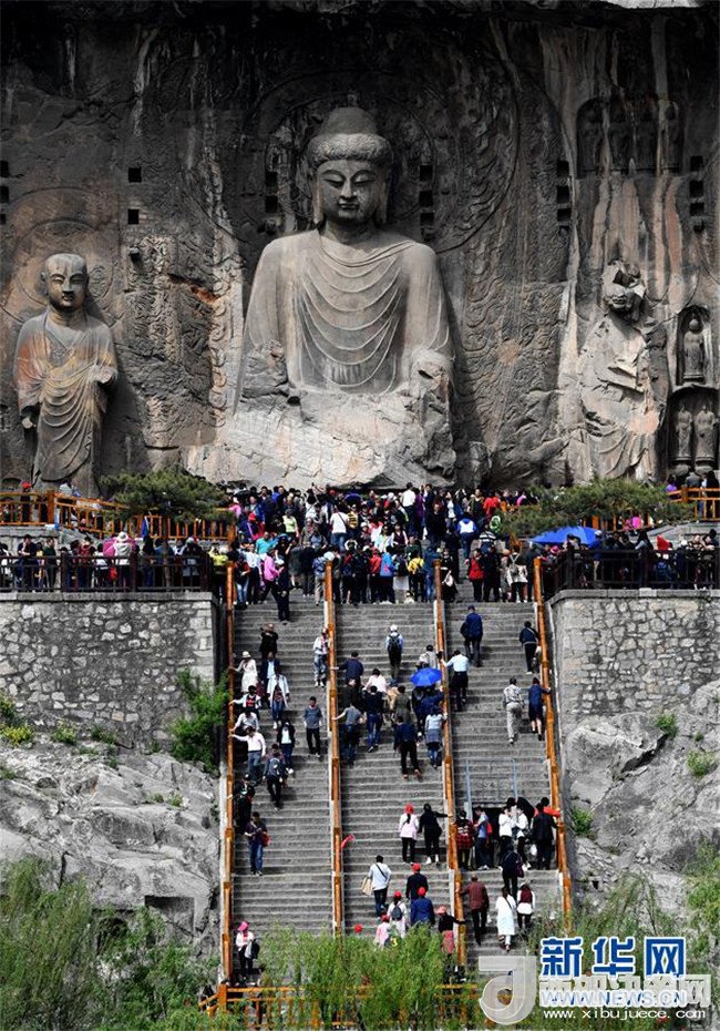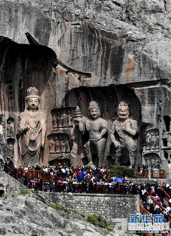 4月11日,游客在河南洛陽(yáng)龍門石窟景區(qū)參觀游覽。