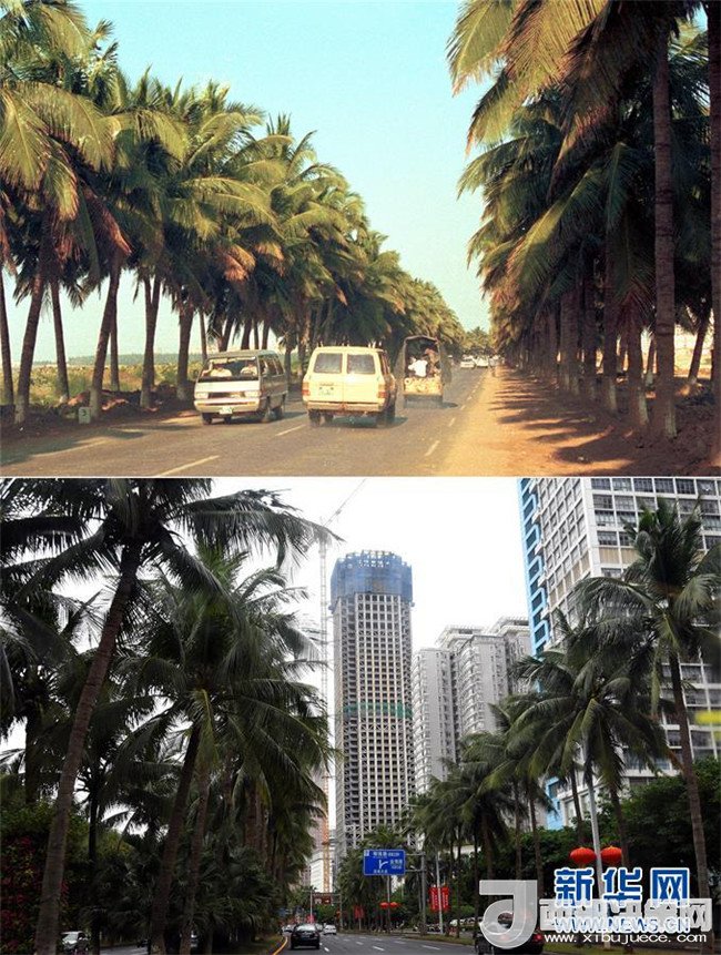 拼版照片為海口市濱海大道今昔對(duì)比(上圖為1990年1月10日新華社記者姜恩宇攝,下圖為2018年4月15日新華社記者趙穎全攝)。