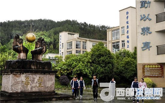 木魚中學(xué)的學(xué)生們從校園里的“希望”雕塑前走過(4月24日攝)。