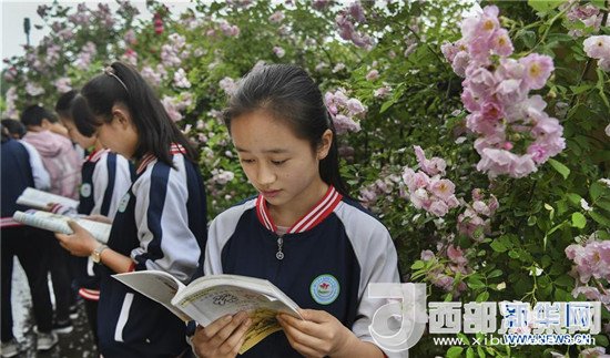 木魚中學(xué)的學(xué)生們在校園的鮮花叢中閱讀課文(4月24日攝)。
