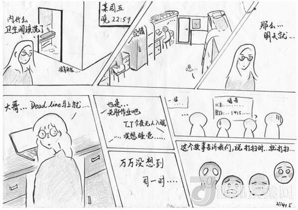 “當聽說要畫檢討,我的第一反應是‘竟然還有這種操作’?!”一位因寢室衛(wèi)生不達標而交給李雍一張“漫畫體”檢討的學生告訴記者,相比文字的檢討,她對于畫畫這件事更容易接受。“因為文字檢討很多時候就是湊字數,可能寫完沒幾天就忘了;但是畫漫畫檢討,需要把犯錯的原因以及反思都濃縮在一幅畫里,既要構圖還要有形象創(chuàng)作,這樣一來,對做錯事的印象會越發(fā)深刻,也更能夠走心。”