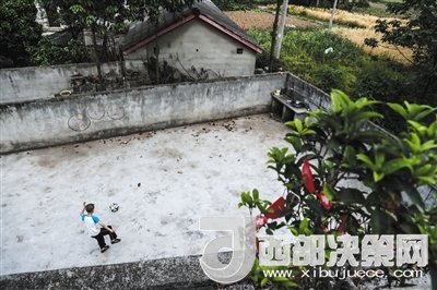 周末回家的一名小球員在自家門口的空地上對(duì)著墻上的靶環(huán)練習(xí)腳法。