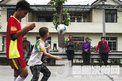 兩名小球員在街道上邊走邊玩球。有些鄉(xiāng)親還是認(rèn)為踢球是不務(wù)正業(yè),會(huì)影響讀書。