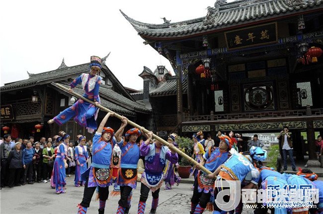 演員在汶川縣水磨鎮(zhèn)萬年臺(tái)進(jìn)行民俗表演(2012年5月23日攝)。新華社發(fā)(王飛 攝)