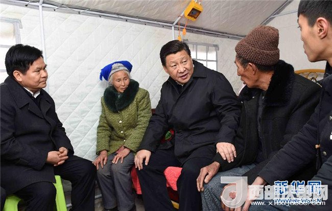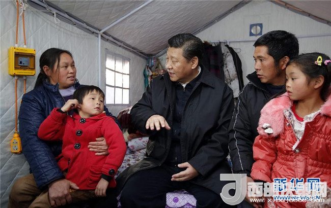 2015年1月19日至21日,中共中央總書記、國(guó)家主席、中央軍委主席習(xí)近平來(lái)到云南昭通、大理、昆明等地,看望魯?shù)榈卣馂?zāi)區(qū)干部群眾,深入企業(yè)、工地、鄉(xiāng)村考察,就災(zāi)后恢復(fù)重建和經(jīng)濟(jì)社會(huì)發(fā)展情況進(jìn)行調(diào)研。這是1月19日,習(xí)近平來(lái)到魯?shù)榭h小寨鎮(zhèn)甘家寨紅旗社區(qū)過(guò)渡安置點(diǎn),走進(jìn)鄒體富老兩口和孫子住的帳篷,詢問(wèn)家里吃飯、補(bǔ)助、收入等問(wèn)題。新華社記者 張鐸 攝