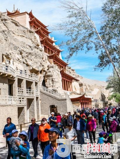 圖為莫高窟九層樓前人潮涌動。 王斌銀 攝