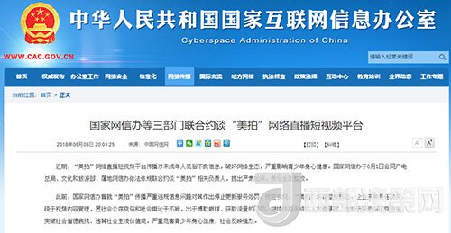 北京6月4日電據(jù)國家網(wǎng)信辦官網(wǎng)消息,近期,“美拍”網(wǎng)絡(luò)直播短視頻平臺傳播涉未成年人低俗不良信息,破壞網(wǎng)絡(luò)生態(tài),嚴(yán)重影響青少年身心健康。國家網(wǎng)信辦于6月1日會同廣電總局、文化和旅游部、屬地網(wǎng)信辦依法依規(guī)聯(lián)合約談“美拍”相關(guān)負(fù)責(zé)人,提出嚴(yán)肅批評,責(zé)令全面整改。