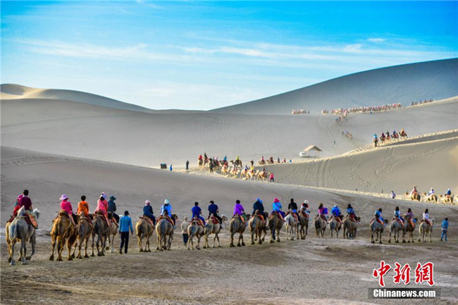 今年端午節(jié)期間,敦煌鳴沙山下駝隊(duì)如龍。王斌銀 攝