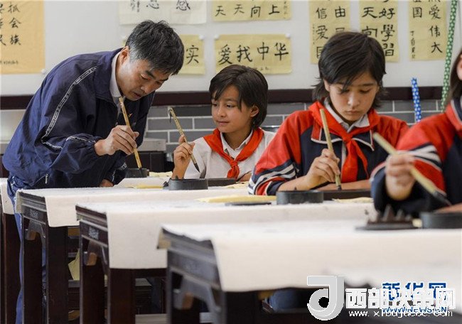 2017年9月26日,在新疆疏附縣托克扎克鎮(zhèn)中心小學(xué)書法教室內(nèi),王莊鐵老師在教同學(xué)們寫毛筆字。新華社記者 趙戈 攝