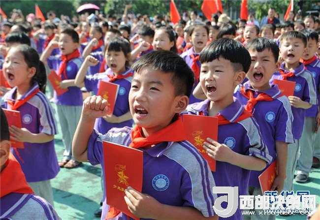 在2017年5月26日安徽省亳州市譙城區(qū)風(fēng)華小學(xué)舉行的入隊(duì)儀式上,孩子們在宣讀入隊(duì)誓詞。新華社發(fā)(張延林 攝)