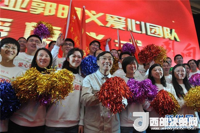 在2012年3月4日舉行的“中央企業(yè)郭明義愛心團(tuán)隊(duì)”授旗儀式現(xiàn)場,郭明義與愛心團(tuán)隊(duì)合影。新華社發(fā)(胡慶明 攝)