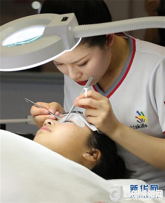 在第45屆世界技能大賽全國(guó)選拔賽上海賽區(qū)比賽中,一名美容項(xiàng)目參賽選手(上)在進(jìn)行植睫毛操作(6月13日攝)。新華社記者 方喆 攝