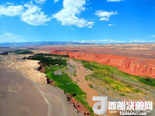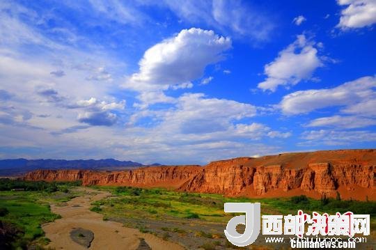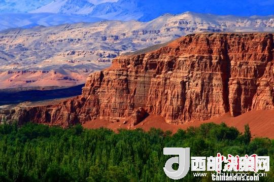 站在天山紅河谷入口處的斷崖邊,可以清晰地看到遠處的天山,天然的紅土飄帶,一簇簇的綠蔭,坐落有致的農(nóng)家院落。荒涼的戈壁與斷崖下的美景,給人以強烈的視覺沖擊。紅色的山巖,猶如一條鑲嵌在天際間的飄帶而光彩奪目,河谷內(nèi)寧靜的村莊透露著幾分神秘。