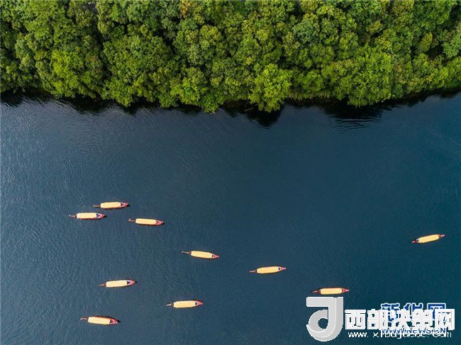 7月23日,游客乘船在新安江浙江建德段江面上游玩(無人機(jī)拍攝)。