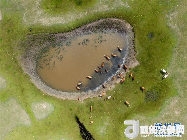 牛群在錫林郭勒盟正藍(lán)旗的草原上飲水(7月16日無人機拍攝)。