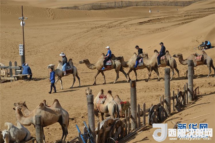 7月21日,在內(nèi)蒙古庫布其沙漠響沙灣景區(qū),游客體驗騎駱駝。新華社記者 鄒予 攝