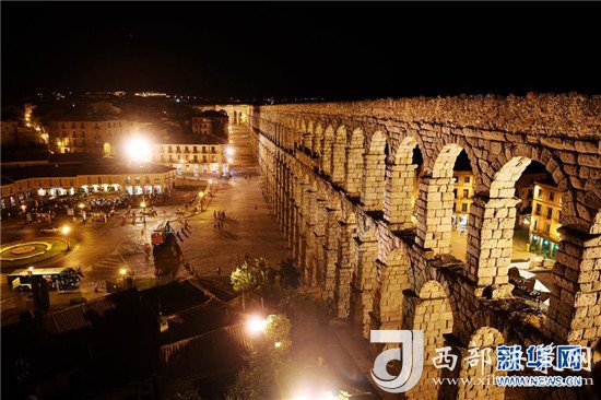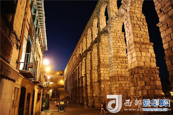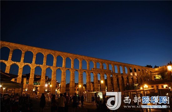 這是8月5日在西班牙塞哥維亞拍攝的古羅馬輸水道夜景。