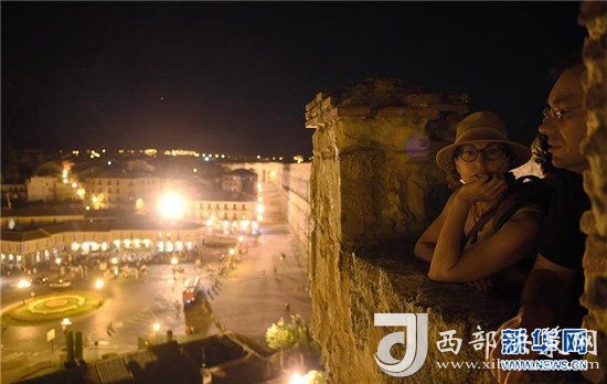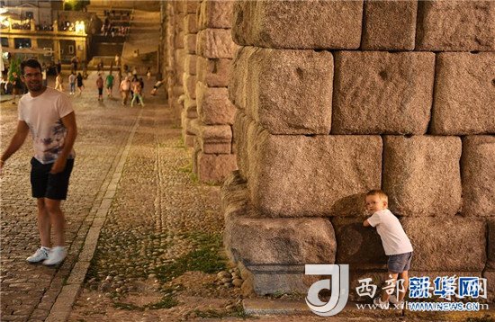 8月5日,在西班牙塞哥維亞,游客在觀景臺(tái)上欣賞古羅馬輸水道夜景。