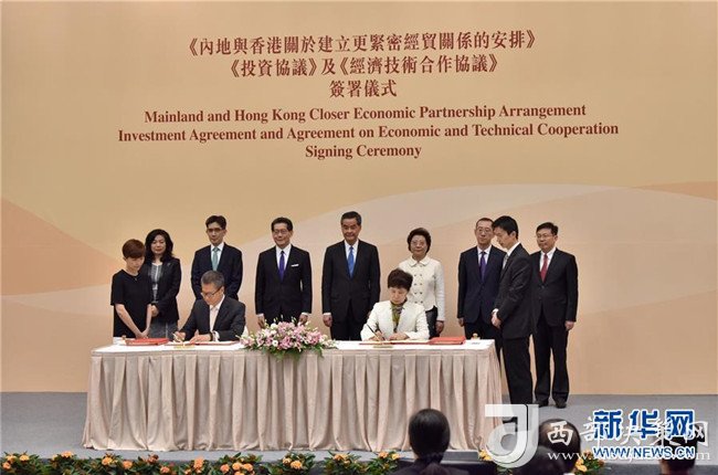 2017年6月28日在香港特區(qū)政府總部拍攝的《內(nèi)地與香港關(guān)于建立更緊密經(jīng)貿(mào)關(guān)系的安排》(CEPA)下的《投資協(xié)議》和《經(jīng)濟(jì)技術(shù)合作協(xié)議》簽約儀式現(xiàn)場。 新華社發(fā)(王璽攝)