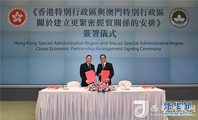 香港特區(qū)政府財(cái)政司司長陳茂波(右)和澳門特區(qū)政府經(jīng)濟(jì)財(cái)政司司長梁維特在香港簽署《香港特別行政區(qū)與澳門特別行政區(qū)關(guān)于建立更緊密經(jīng)貿(mào)關(guān)系的安排》(2017年10月27日攝)。新華社記者呂小煒攝
