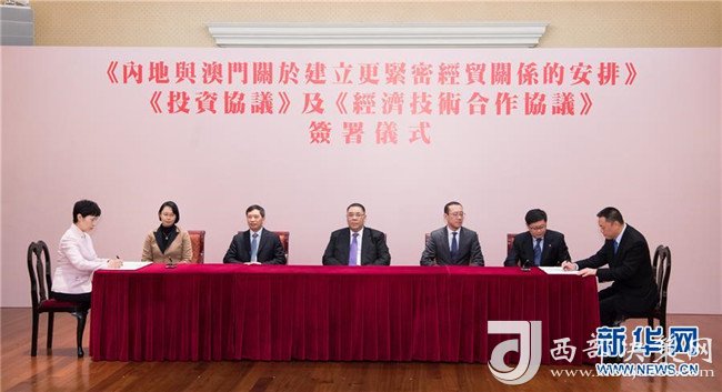 2017年12月18日拍攝的商務(wù)部與澳門特區(qū)政府《內(nèi)地與澳門關(guān)于建立更緊密經(jīng)貿(mào)關(guān)系的安排》(CEPA)下的《投資協(xié)議》和《經(jīng)濟(jì)技術(shù)合作協(xié)議》簽約儀式現(xiàn)場。新華社記者張金加攝