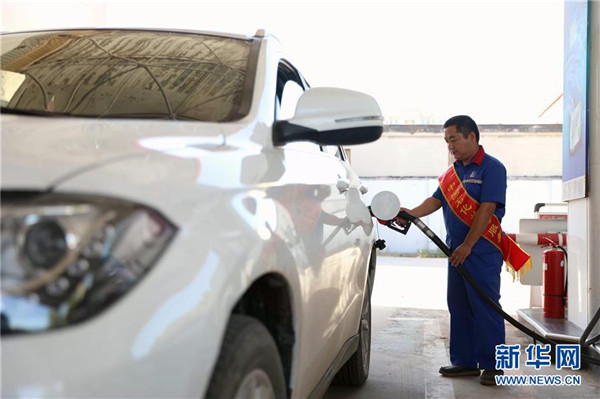 9月3日,江蘇省連云港市一家加油站的工作人員給車輛加油。 當(dāng)日,國家發(fā)展改革委發(fā)布消息,按照現(xiàn)行成品油價格形成機制,自2018年9月3日24時起,國內(nèi)汽油、柴油價格每噸分別上調(diào)180元和170元。 新華社發(fā)(王春 攝)