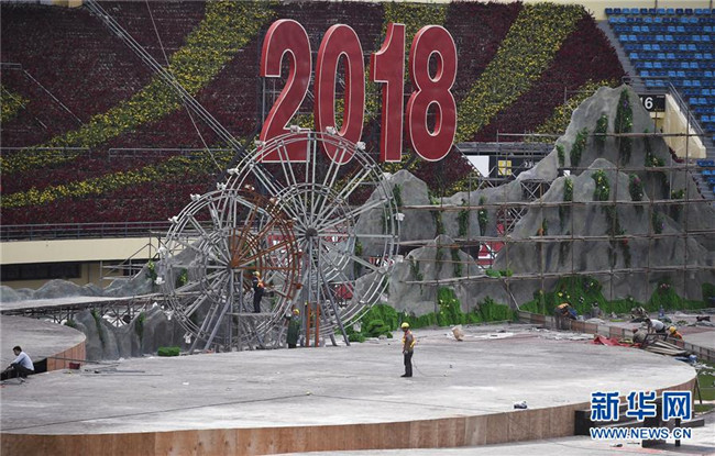 9月4日,工人在賀蘭山體育場搭建舞臺(tái)。