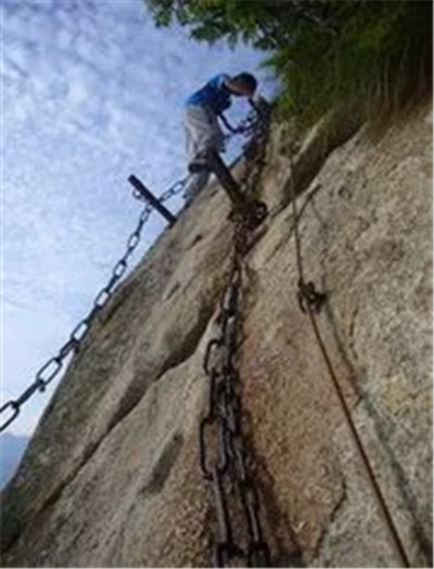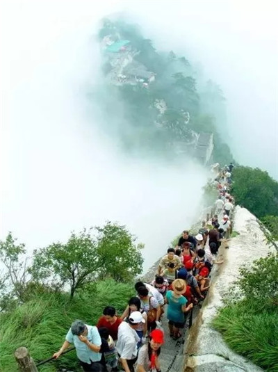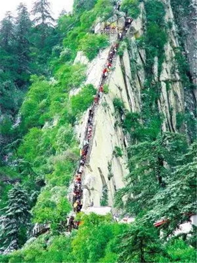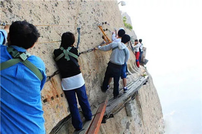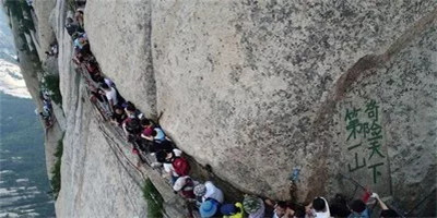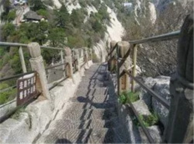 具有700多年歷史的長(zhǎng)空棧道,在華山南峰東側(cè)山腰的萬(wàn)仞絕壁上鑿出來(lái)的幾個(gè)踏腳之處,鑲嵌石釘搭木椽搭建了一個(gè)百余米懸空的棧道,讓人望而卻步,如果你有恐高癥,僅僅看一眼都會(huì)讓你驚恐萬(wàn)分。2013年,著名旅游網(wǎng)站“Smarter Travel”盤點(diǎn)全球最恐怖懸崖步道,將華山長(zhǎng)空棧道列為全球十大最恐怖的懸崖步道之一。