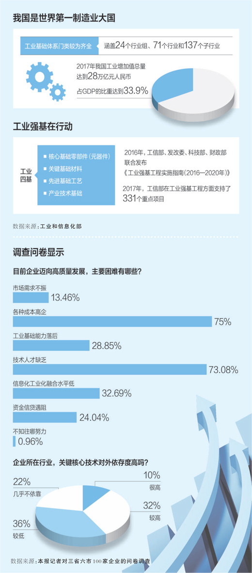 “要實現(xiàn)從‘有’到‘好’的轉(zhuǎn)變,在高端產(chǎn)品上突破,還需要時間。”調(diào)查中企業(yè)坦言,我國部分核心技術、關鍵產(chǎn)品和重大裝備仍存瓶頸制約,一些工業(yè)產(chǎn)品在一致性、穩(wěn)定性和使用壽命方面與國外先進水平差距較大,工業(yè)基礎須進一步夯實。