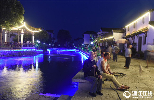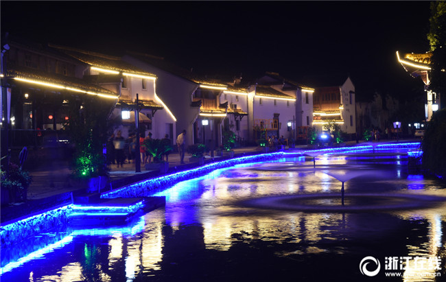 9月10日傍晚,杭州富陽東梓關(guān)村亮燈工程開啟,村里的屋檐走廊被霓虹燈照亮,古村就像一顆夜明珠,璀璨奪目。昔日傳統(tǒng)村落華麗轉(zhuǎn)身,正吸引越來越多的游客前來游玩。(浙江在線記者 吳元峰 攝)