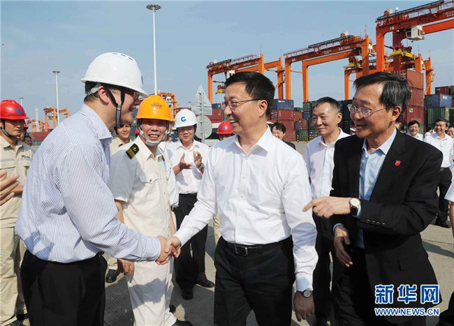 這是9月12日,韓正前往欽州保稅港區(qū),考察南向通道建設。 新華社記者 劉衛(wèi)兵 攝