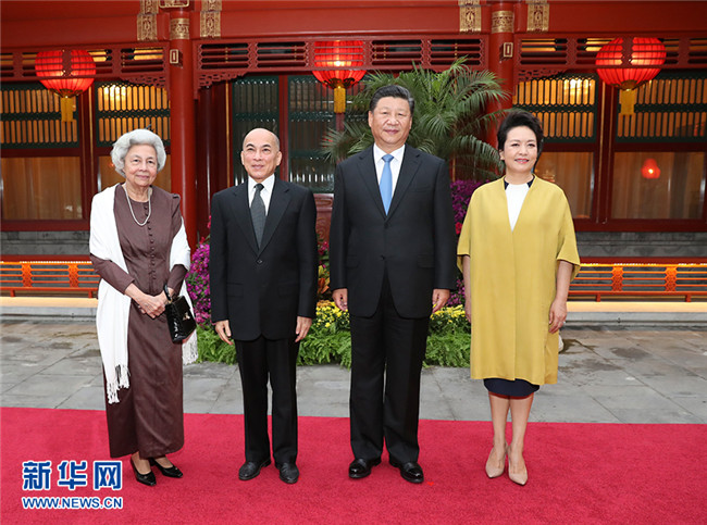 9月19日,在中秋佳節(jié)來臨之際,國家主席習(xí)近平和夫人彭麗媛在釣魚臺(tái)國賓館親切看望正在北京休養(yǎng)的柬埔寨國王西哈莫尼和太后莫尼列。新華社記者 黃敬文 攝