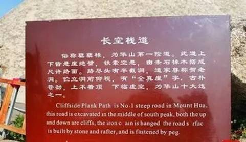 在約2160米高的峭壁上鑿出踏腳之處,鑲嵌石釘搭木椽并用鐵索固定建造的一條懸空棧道,那就是長空棧道。它位于華山極頂南峰東側南天門外的山腰間,經燕子叼表、朝元洞,踩崖隙凌空懸梯下10余華山長空棧道米,沿附懸崖而搭寬不盈尺的方木棧道至全真巖下。
