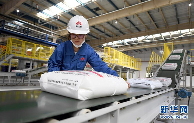 延安煤油氣資源綜合利用項目包裝車間的工作人員進(jìn)行產(chǎn)品包裝檢查(9月28日攝)。新華社記者 劉瀟 攝