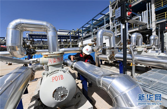 延安煤油氣資源綜合利用項目甲醇制烯烴中心的工作人員進(jìn)行設(shè)備巡檢(9月28日攝)。新華社記者 劉瀟 攝