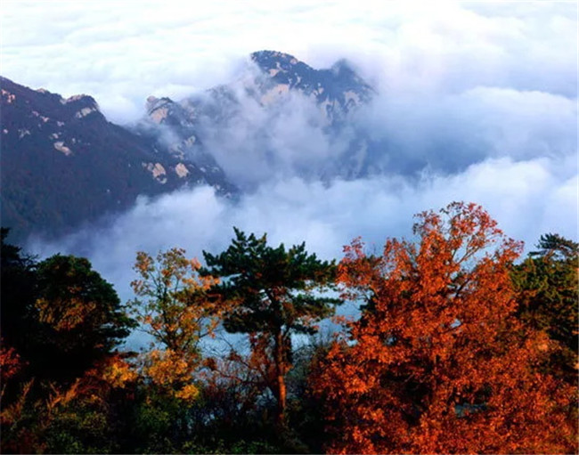 鷂子翻身、長空棧道、蒼龍嶺,更是險(xiǎn)中紅葉別樣紅。西峰上茫茫云海,紅葉相伴,美輪美奐。