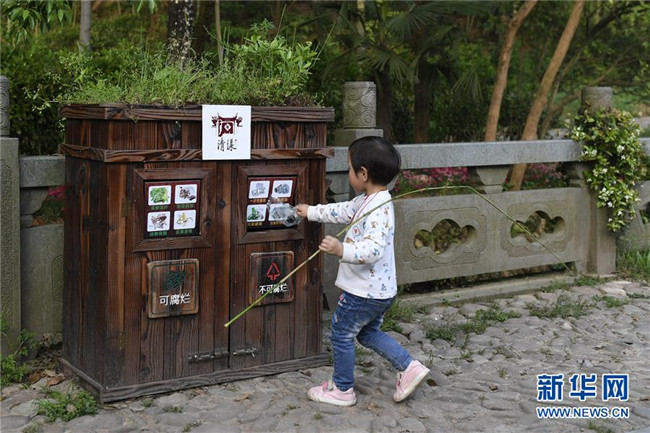 在浙江省衢州江山市石門(mén)鎮(zhèn)清漾村,小朋友將垃圾分類(lèi)放入垃圾箱內(nèi)(4月20日攝)。新華社記者 黃宗治 攝