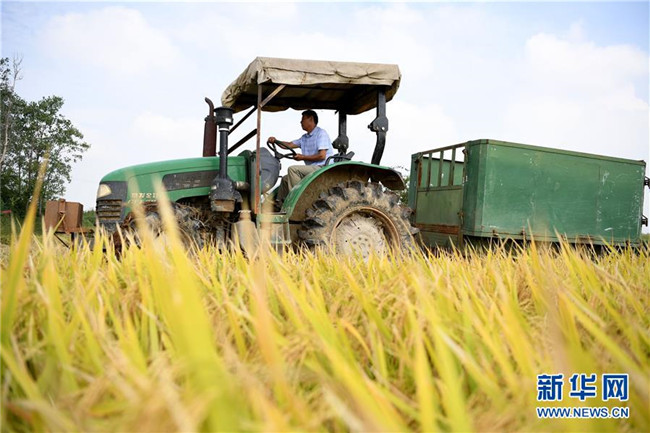 安徽省肥西縣山南鎮(zhèn)小井莊村種糧大戶(hù)陳良玉駕駛拖拉機(jī)運(yùn)送剛收割的水稻(9月12日攝)。 新華社記者 劉軍喜 攝