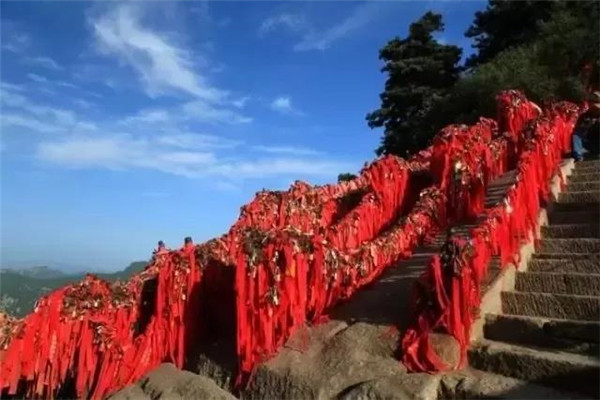 到達(dá)金鎖關(guān)時,一番令人動容的風(fēng)景——金鎖關(guān)關(guān)內(nèi)、關(guān)外登山路兩側(cè)的鐵索上,情侶鎖重重疊疊,紅繩彩線迎風(fēng)搖曳,筑成一道美麗的愛情心愿風(fēng)景線。 眼前大片大片的紅色,令游人的視覺和心靈受到強(qiáng)烈的沖擊。這是沿路兩邊鐵鏈上綁滿的密密麻麻的紅色絲繩,不留一絲空隙,風(fēng)吹來,長長的紅色絲繩就輕盈的舞起來,如愛情牢固的臂膀,甜蜜的飛翔在華山之上。