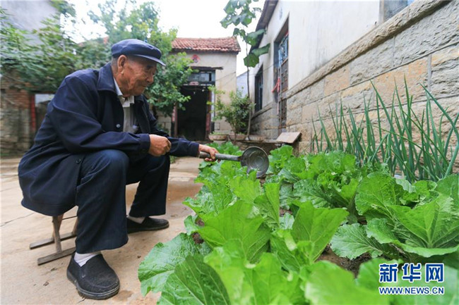 山東沂水縣龍家圈街道寨里社區(qū)居民王培義老人在給家中的院子里蔬菜澆水(10月9日攝)。得益“四權(quán)分置”的制度設(shè)計(jì),今年89歲的貧困戶王培義已連續(xù)3年收到草莓大棚效益分紅。新華社記者 王南 攝