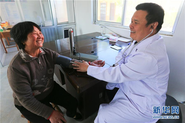 在山東蒙陰縣云夢湖生態(tài)區(qū)東汶社區(qū)的農(nóng)村幸福院養(yǎng)老院的醫(yī)務(wù)室,醫(yī)生為老人測量血壓(10月11日攝)。2016年,東汶社區(qū)將原來的村兩委大院擴(kuò)建為農(nóng)村幸福院養(yǎng)老院,委派專人負(fù)責(zé)老人們的一日三餐。同時(shí)按照“子女交納、集體補(bǔ)助、社會捐贈、財(cái)政獎勵(lì)”的模式設(shè)立孝心養(yǎng)老基金,每月定時(shí)發(fā)給貧困老人。新華社記者 王南 攝