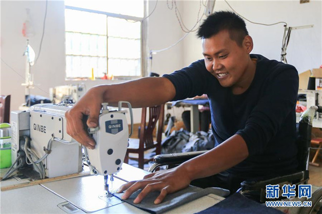 在山東蘭陵縣礦坑鎮(zhèn)朱柳屯村的扶貧車間,貧困戶范加誠操作縫紉機(jī)加工布料(10月10日攝)。今年29歲的范加誠八年前在建筑工地打零工時(shí)被因意外造成高位截癱。2016年,5萬元扶貧貸款為范加誠扶貧車間建設(shè)送來“及時(shí)雨”。一個(gè)月的時(shí)間,他就有了寬敞明亮的加工車間和8臺嶄新的縫紉機(jī)。新華社記者 王南 攝