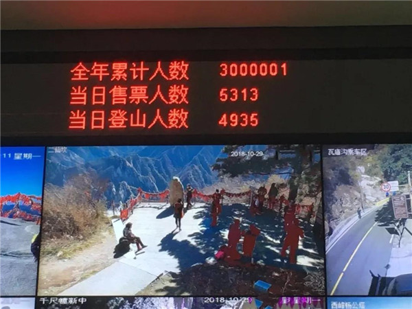 在全國(guó)慶祝改革開(kāi)放40周年之際,10月29日11時(shí),華山景區(qū)迎來(lái)了今年購(gòu)票登山人數(shù)300萬(wàn)人次的歷史性時(shí)刻。