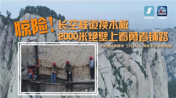 央視新聞?lì)l道對(duì)“華山長(zhǎng)空棧道更換木板”進(jìn)行直播